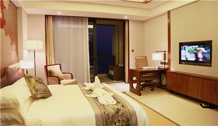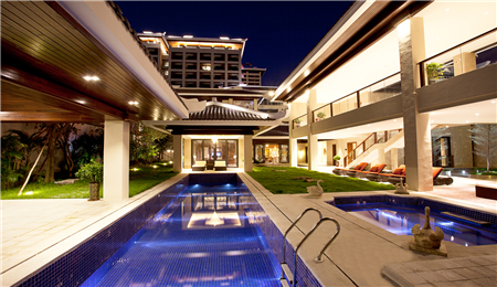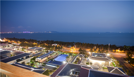 以中轴线为界,大堂中心点为室内水景区,拾级而下,进入高近十米的半敞开式大堂休闲吧,及空间融为一体的室外观景平台,可饱览无敌海景。大堂左侧回廊动态流畅,而右侧回廊可至巴厘岛风情的SPA休闲区。 在负一层的人们,可以体验到以海洋味设计主题的KTV包房区,在此可以尽情地一展歌喉。伴随着浑然天成的室外景观水景、私家泳池,信步闲庭的人们,不经意间可到达别墅区域。 酒店设有健身房、棋牌室、台球馆、游泳池、以及儿童乐园等多种康体设施。其中,地下室建有可举办国家级体育赛事的专业乒乓球馆和网球馆,建筑面积2400㎡。酒店的电影院,足不出户便可让您放松身心,高品质的大屏幕可让您身临其境。